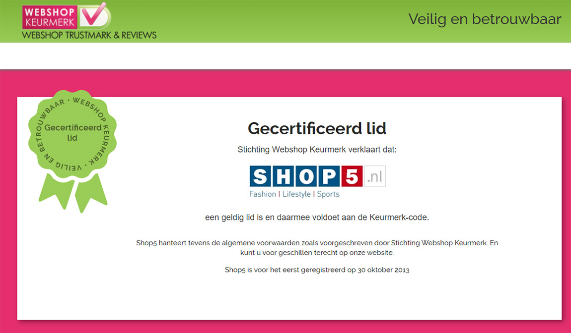 Sinds 30 oktober 2013 is Shop5.nl aangesloten bij Stichting Webshop Keurmerk. Dit keurmerk voert een grondige inspectie uit voordat zij tot certificering overgaat. Zo wordt gekeken of u veilig kan betalen, of uw gegevens veilig worden opgeslagen en of wij ons wel aan alle voorwaarden houden.